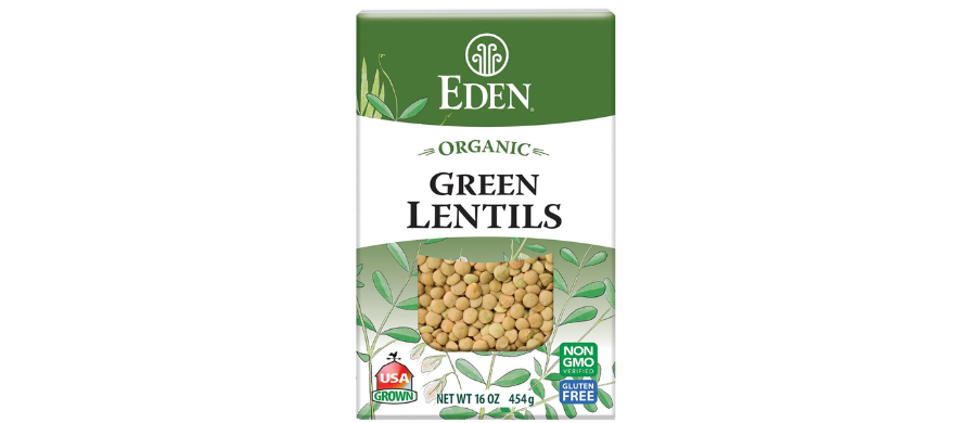 Try Eden Foods Green Lentils. Packaged in an eco-friendly box and harvested from mineral-rich soil, these larger-sized organic lentils will also hold their shape well during cooking.