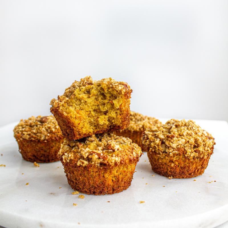 - For the muffins: In a large mixing bowl, whisk together maple syrup (room temperature) and melted butter until well combined. Whisk in eggs, one-at-a-time, until well combined. Stir in grated carrot and vanilla.